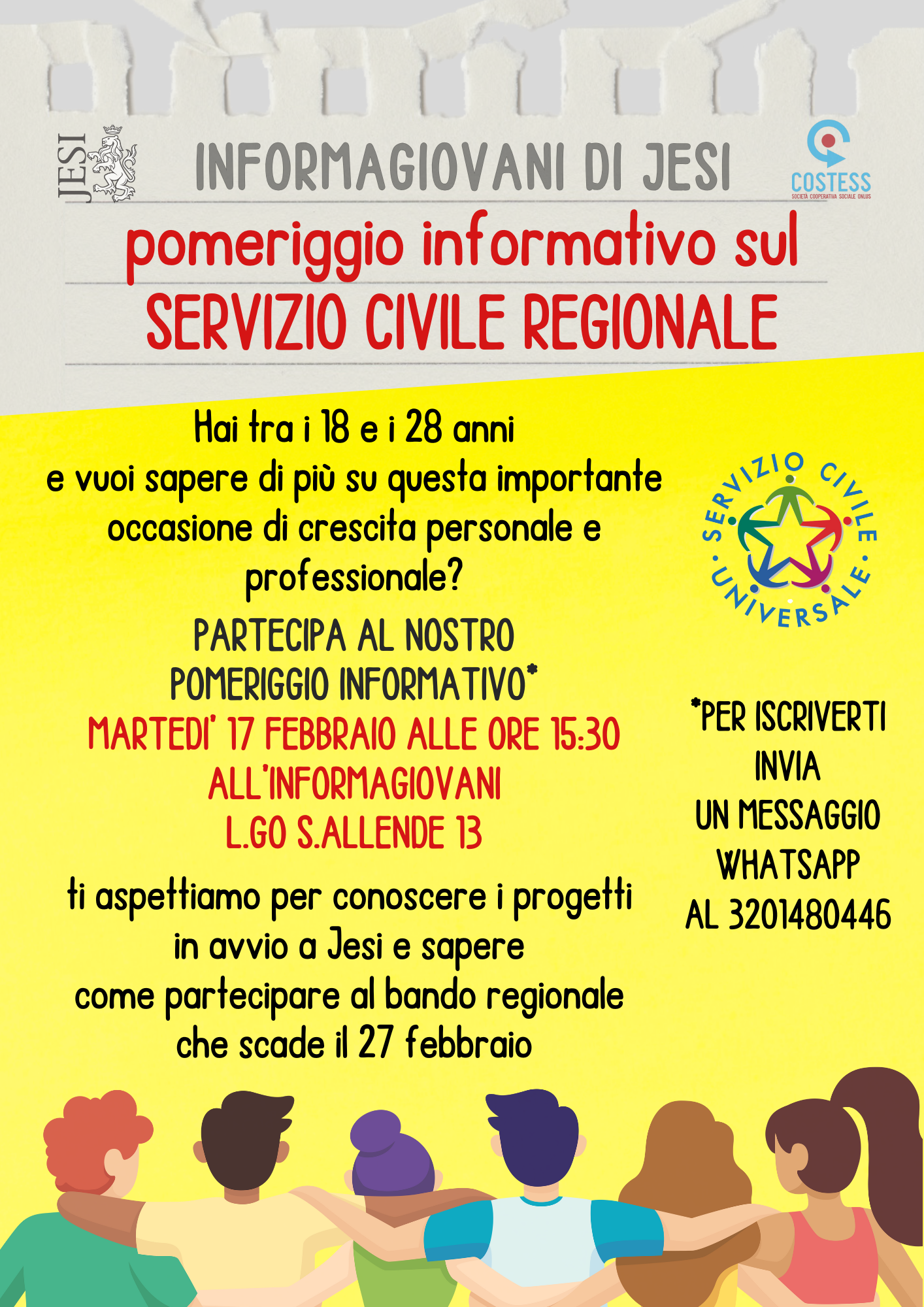 Se hai tra i 18 e i 28 anni e vuoi sapere di più su questa importante occasione di crescita personale e professionale, ti aspettiamo martedì 17 febbraio alle ore 15:30 all’informagiovani, in L.go S.Allende 13